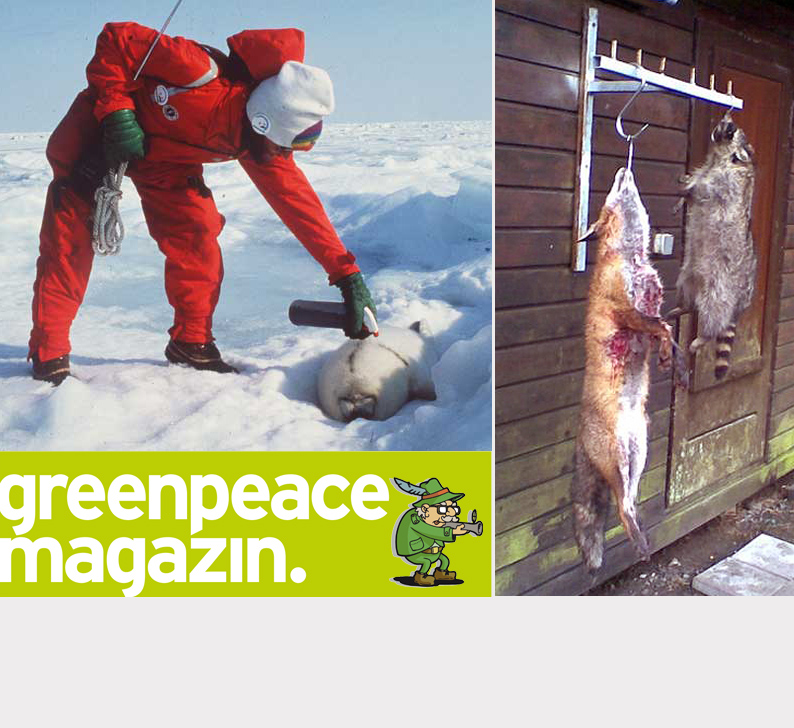 Greenpeace action against seals killing in Canada. Aktivist spraying paint on seal to make its fur worthless.