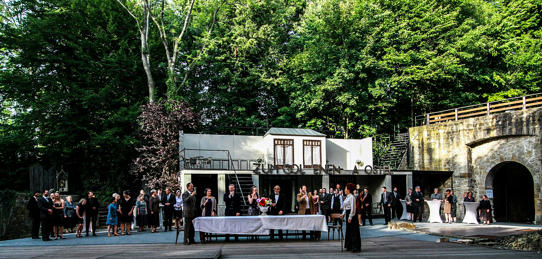Wenn die Tecklenburger Freilichtspiele ihren Personal-Pool aktivieren,stehen bis zu hundert Darsteller auf der von mittelalterlichen Burgmauern eingefassten Open-Air-Bühne. Hier ist nur ein kleiner Teil zu sehen. Die restlichen Mimen stehen im Stand-By. Foto: Heiner Schäffer