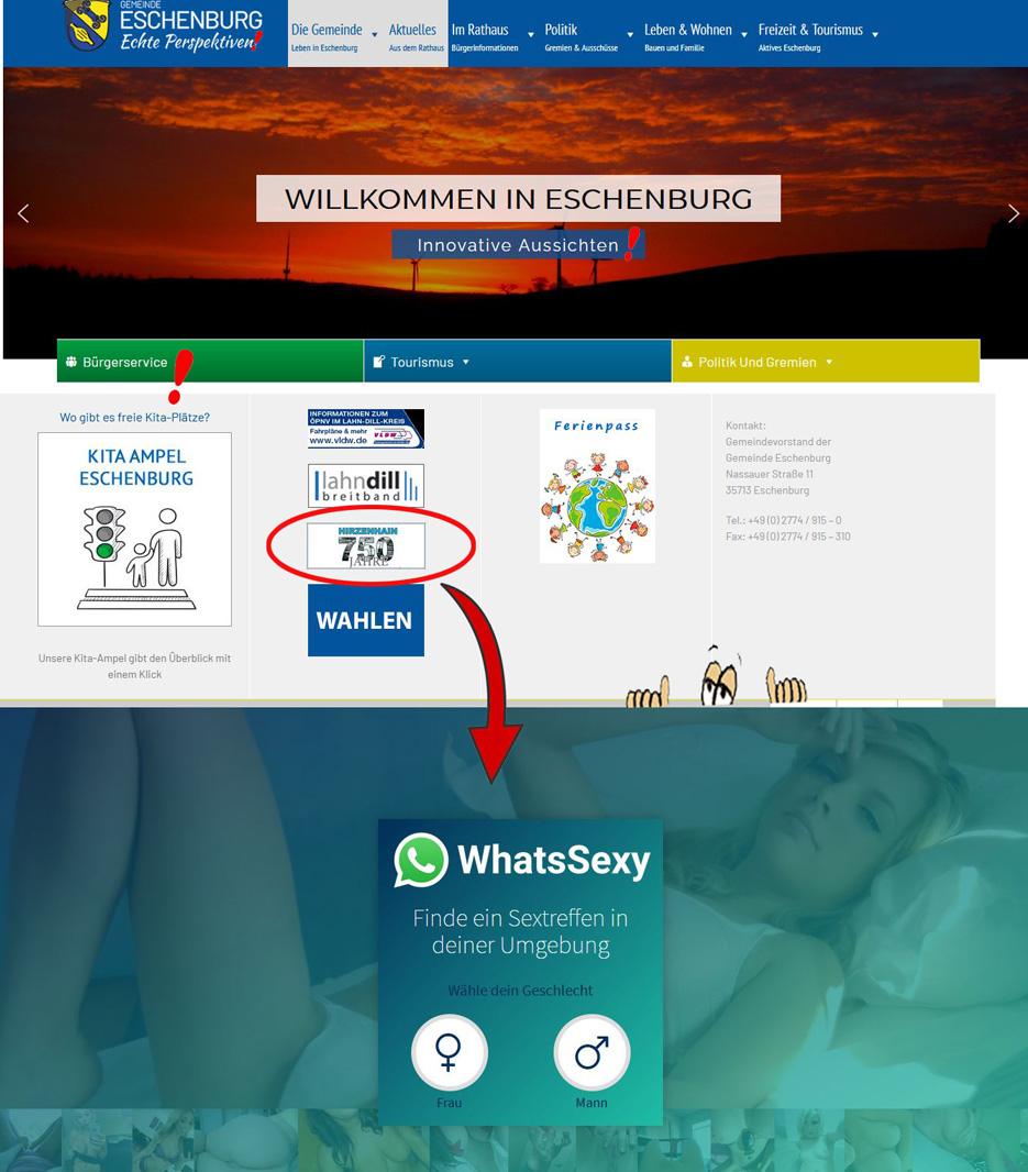 Nichts ist so wie es scheint: Gut getarnt und diskret warb die Gemeinde Eschenburg Monate lang auf ihrem Webportal für einen Sex-Dating-Service. Wer auf den Button „750 Jahre Hirzenhain“ klickte, landete bei einem Anbieter, der heiße Kontakte mit Damen aus unmittelbarer Nähe versprach.